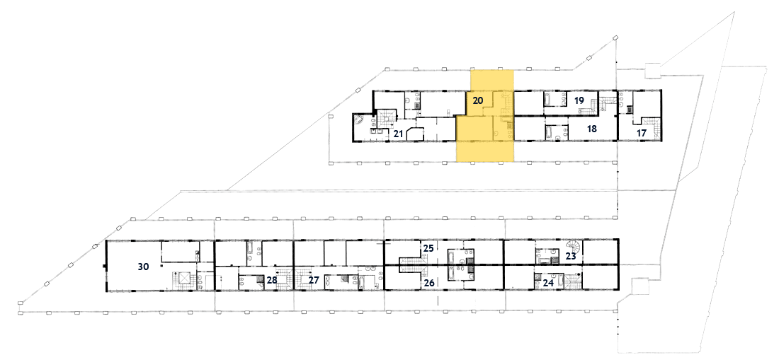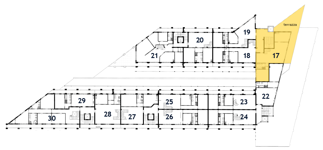 La struttura comprende 3 piani abitativi: al 1° piano si trovano i bilocali e i trilocali, mentre al 2° e 3° piano si trovano gli attici.
