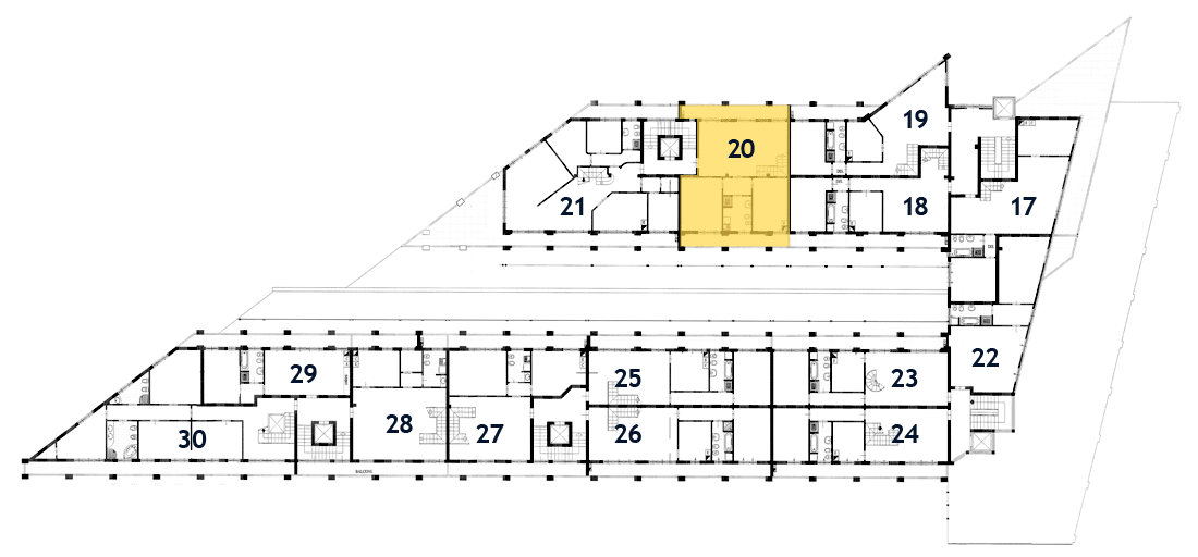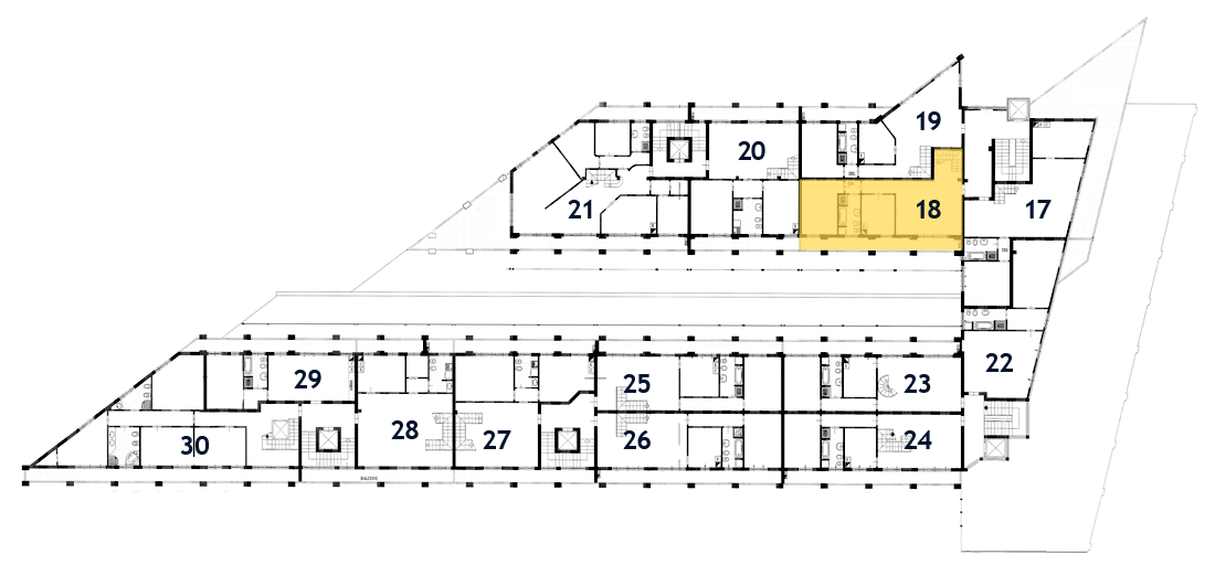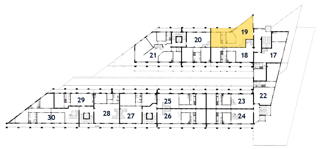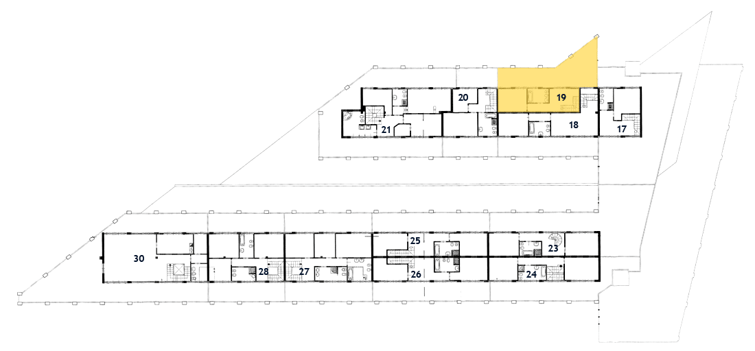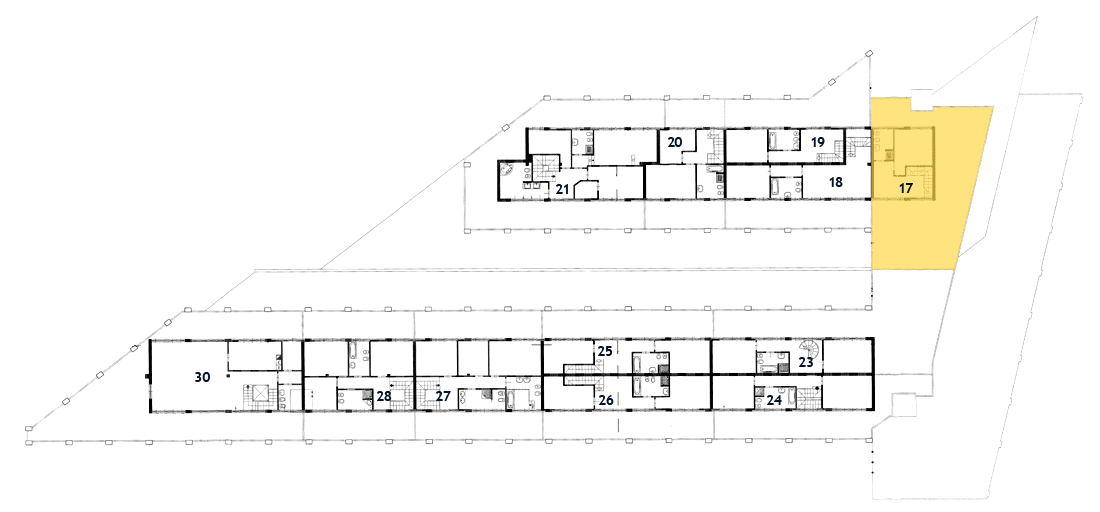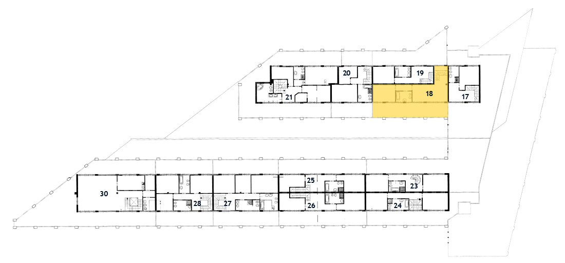 Al piano soppalcato si trovano un bagno e una camera da letto. L’ampia terrazza si affaccia sull’interno del complesso residenziale, con vista sulle mura.