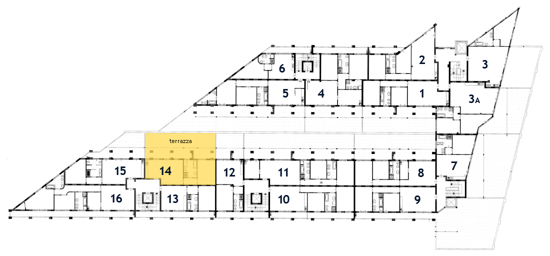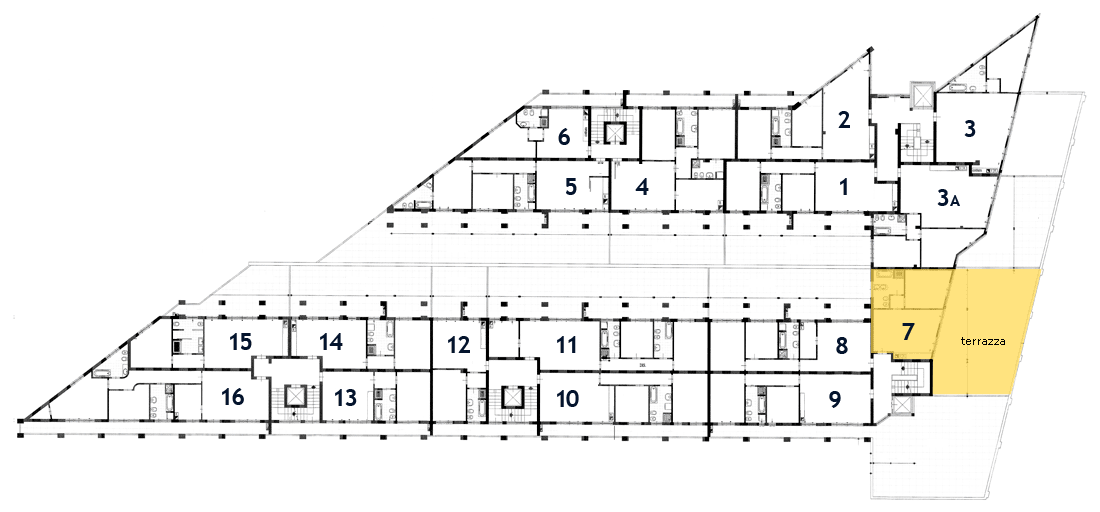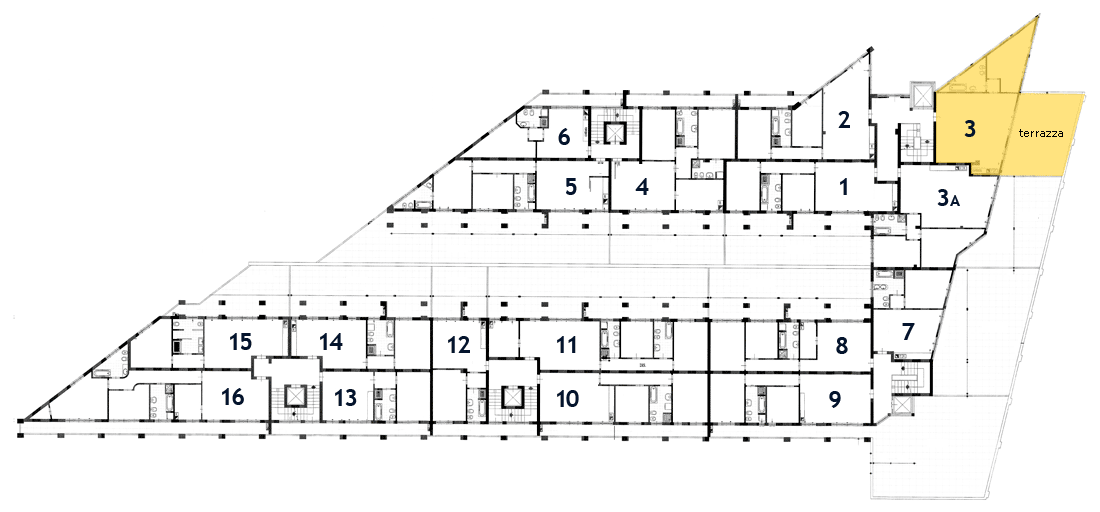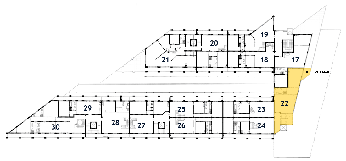 La struttura comprende 3 piani abitativi: al 1° piano si trovano i bilocali e i trilocali, mentre al 2° e 3° piano si trovano gli attici.