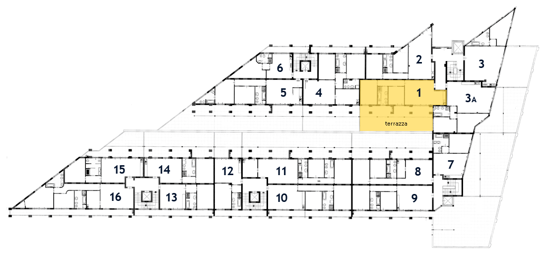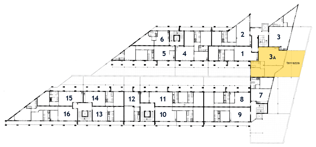 La struttura comprende 3 piani abitativi: al 1° piano si trovano i bilocali e i trilocali, mentre al 2° e 3° piano si trovano gli attici.
